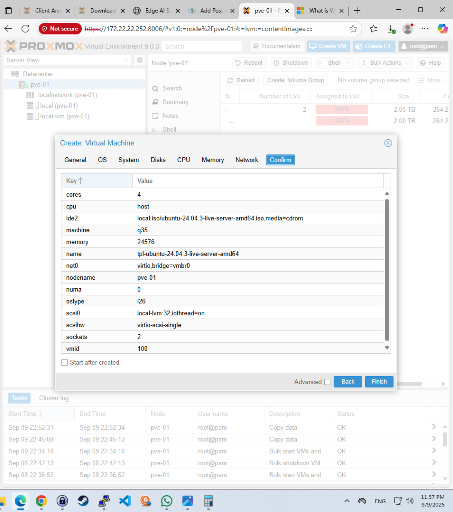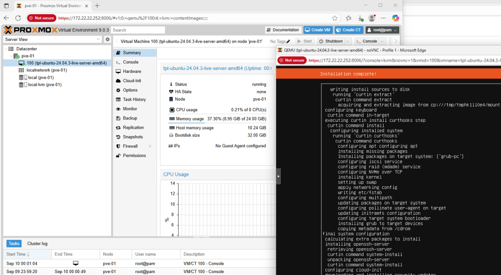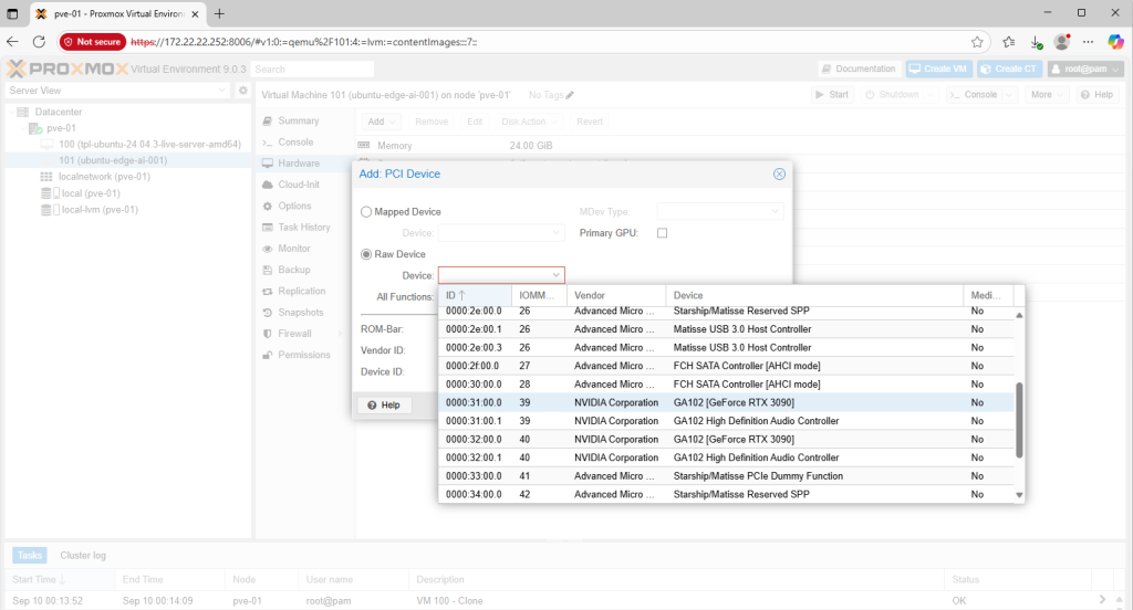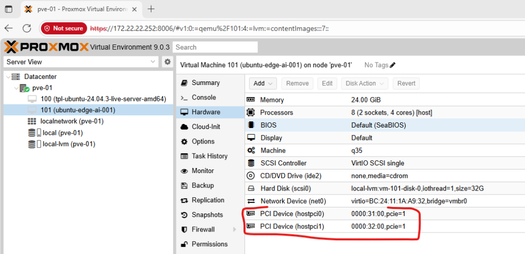 With Proxmox in place and 2× RTX 3090 successfully passed through to an Ubuntu VM, I can run private edge models at home with near bare‑metal performance.