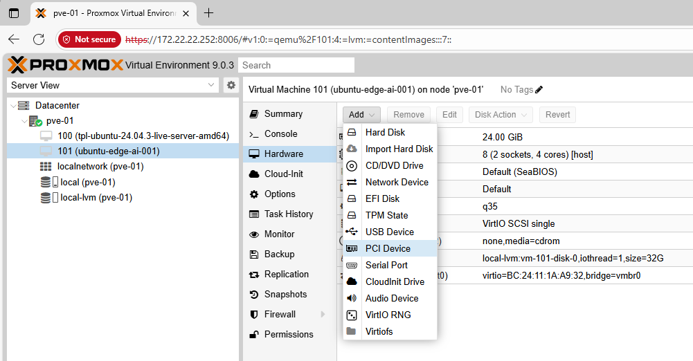 host(later addhidden=1if you plan Windows guests) - Cores/RAM: as needed (I give the Ubuntu AI VM most of the machine)